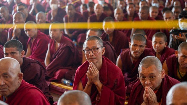 Монахи, расположившиеся в главном зале собраний монастыря Таши Лхунпо, участвуют в поминальном молебне по жертвам землетрясения в Тибете. Билакуппе, штат Карнатака, Индия. 9 января 2025 г. Фото: Тензин Чойджор (офис ЕСДЛ).