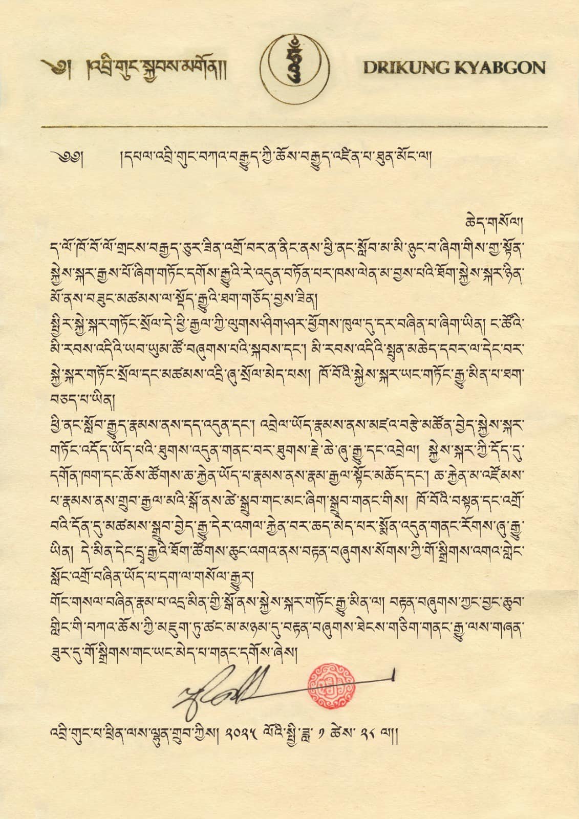 В четвертый день шестого месяца по тибетскому лунному календарю, что в этом году соответствует 28 июля по григорианскому календарю, главе линии дрикунг кагью Его Преосвященству Дрикунгу Кьябгону Четсангу Ринпоче исполняется 80 лет. В преддверии своего дня рождения духовный лидер опубликовал особое обращение к своим последователям, в котором сообщил, что по достижении 80-летия уйдет в длительное затворничество.