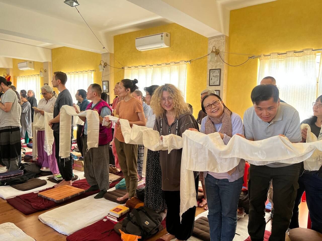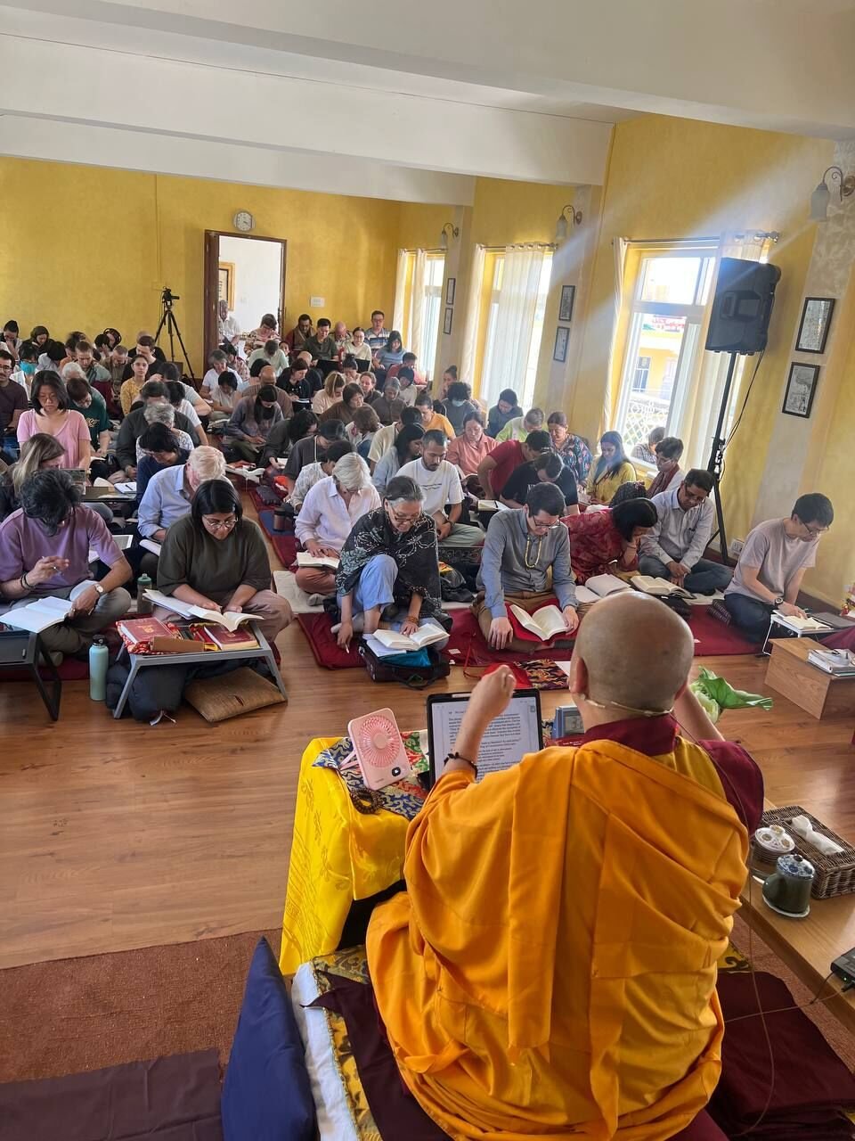 Фото: участники ретрита «Мудрость постижения пустоты» под руководством досточтимого геше Дордже Дамдула. Тибетский дом (Нью-Дели)