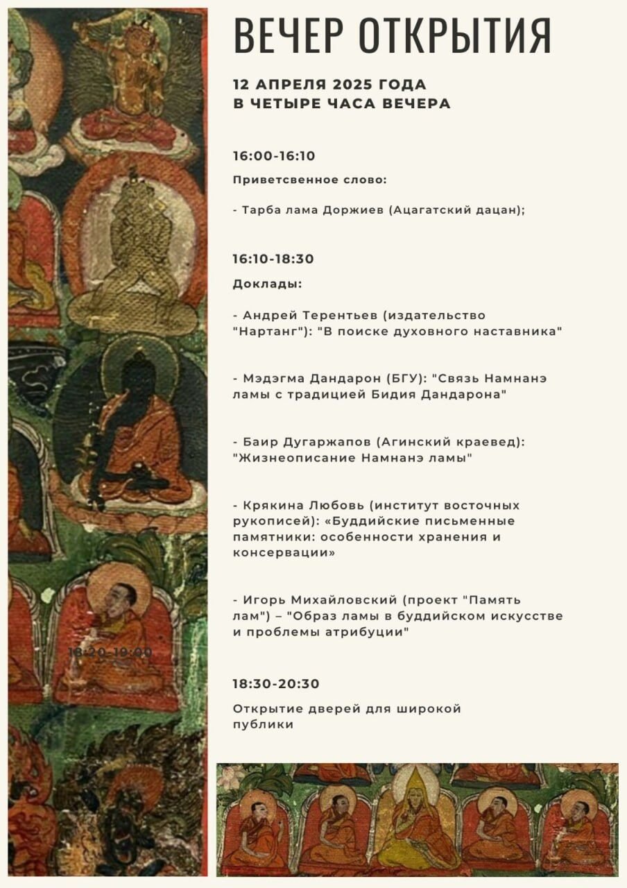 Занятие пройдет перед открытием выставки «Образ ламы, учителя в буддийском искусстве», которую организует проект «Память лам». Это уникальное культурное событие приурочено к 200-летию со дня рождения буддийского учителя Намнанэ-ламы, который оказал значительное влияние на развитие буддизма в России и был наставником таких выдающихся личностей, как Агван Доржиев и Сандан Цыденов.