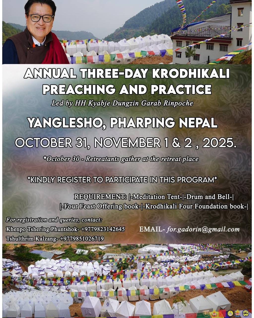 31 октября – 2 ноября в Янглешо (Парпинг, Непал) состоится большое трехдневное собрание по практике Кродхикали (Жаксумпа) под руководством Кьябдже Дунгсе Гараба Ринпоче.