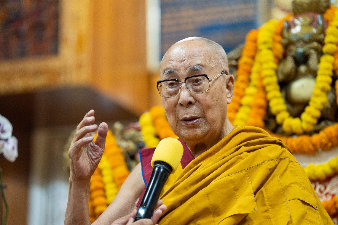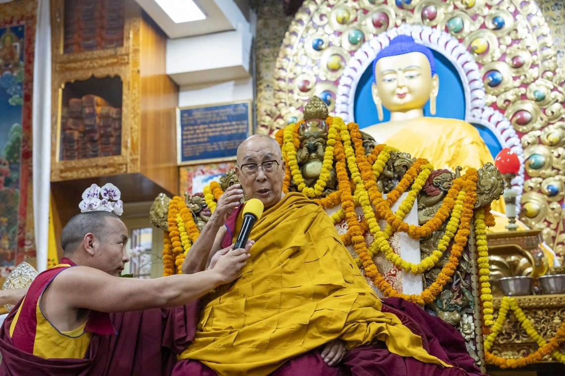 Его Святейшество Далай-лама выступает с обращением по завершении молебна о долголетии, который поднесли ему монастырь Шанг Гаден Чойкхорлинг (Непал) и сообщества Чатринг и Пхари. Дхарамсала, штат Химачал-Прадеш, Индия. 7 мая 2025 г. Фото: Тензин Чойджор (Офис ЕСДЛ)