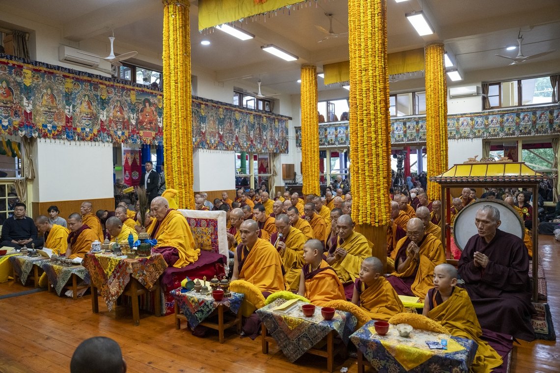 Самдонг Ринпоче возглавляет молебен о долголетии Его Святейшества Далай-ламы. Справа от него – настоятель монастыря Гьюдмед, слева – настоятель монастыря Шанг Гаден Чойкхорлинг и юные воплощения Дромо Геше Ринпоче, Геше Лхундупа Сопы и бывшего настоятеля монастыря Се-Гью. Дхарамсала, штат Химачал-Прадеш, Индия. 7 мая 2025 г. Фото: Тензин Чойджор (Офис ЕСДЛ)