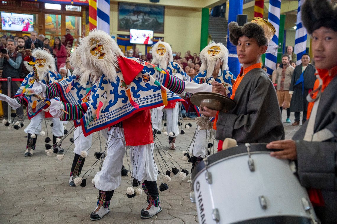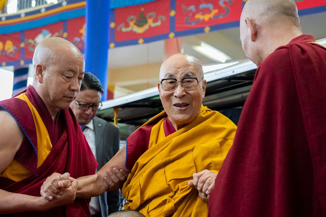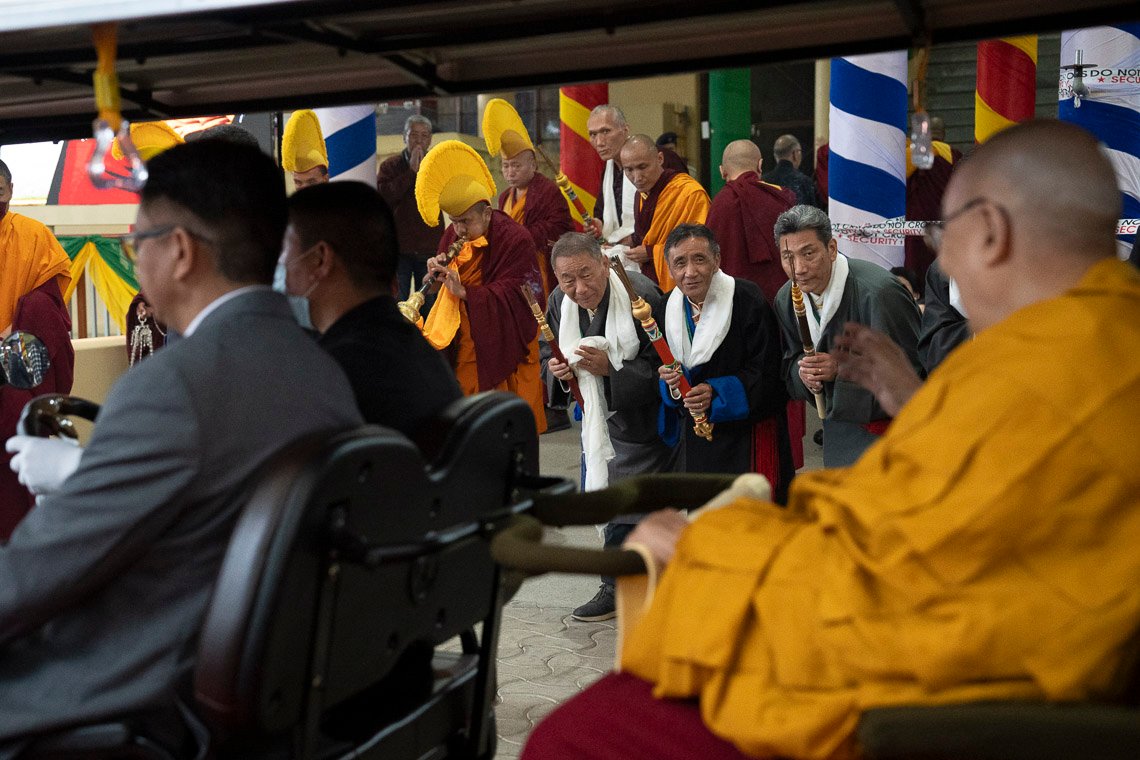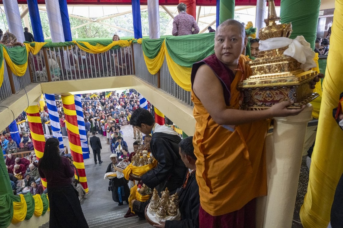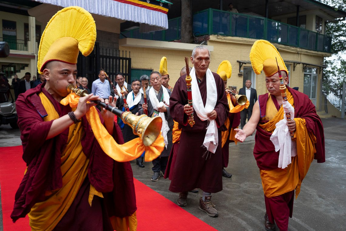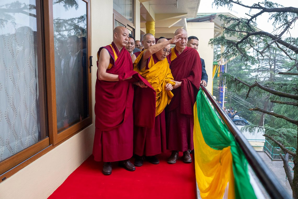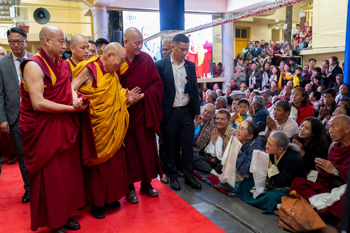 Тхекчен Чолинг, Дхарамсала, штат Химачал-Прадеш, Индия, 7 мая 2025 г. – Ночной дождь прекратился к утру, когда Его Святейшество Далай-лама вышел из ворот своей резиденции и направился через двор в Цуглагкханг, главный тибетский храм. Его сопровождали представители организационного комитета, в который вошли расположенный в Непале монастырь Шанг Гаден Чойкхорлинг, а также сообщества Чатринг и Пхари. Среди них были Янгси Ринпоче и Лобсанг Ньяндак. Его Святейшество улыбался и махал рукой толпе, насчитывавшей порядка 5000 человек. Исполнители танца «Таши шолпа» кружились под музыку и пели в честь прибытия духовного лидера.