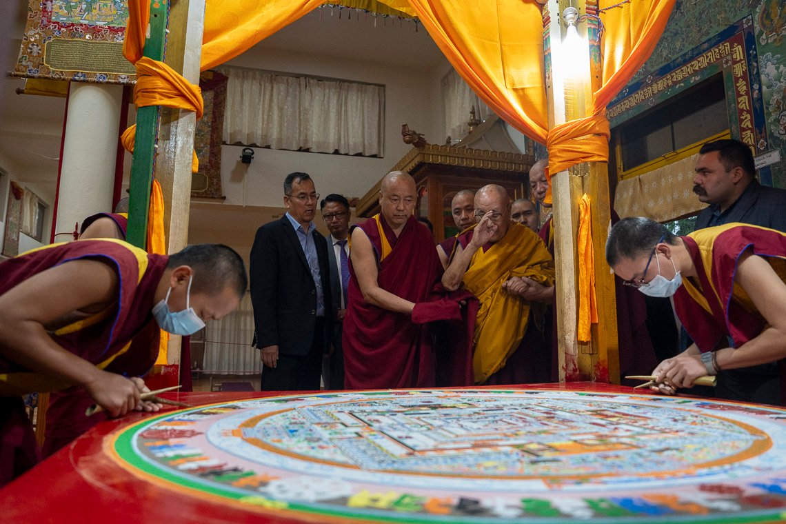 Далай-лама поднялся на лифте на этаж, где расположен храм, и, остановившись на веранде, помахал собравшимся во дворе. После он зашел в храм Калачакры, чтобы посмотреть на песочную мандалу, которую возводят в рамках подготовки к запланированному на этот месяц ритуалу подношения и практики Калачакры.