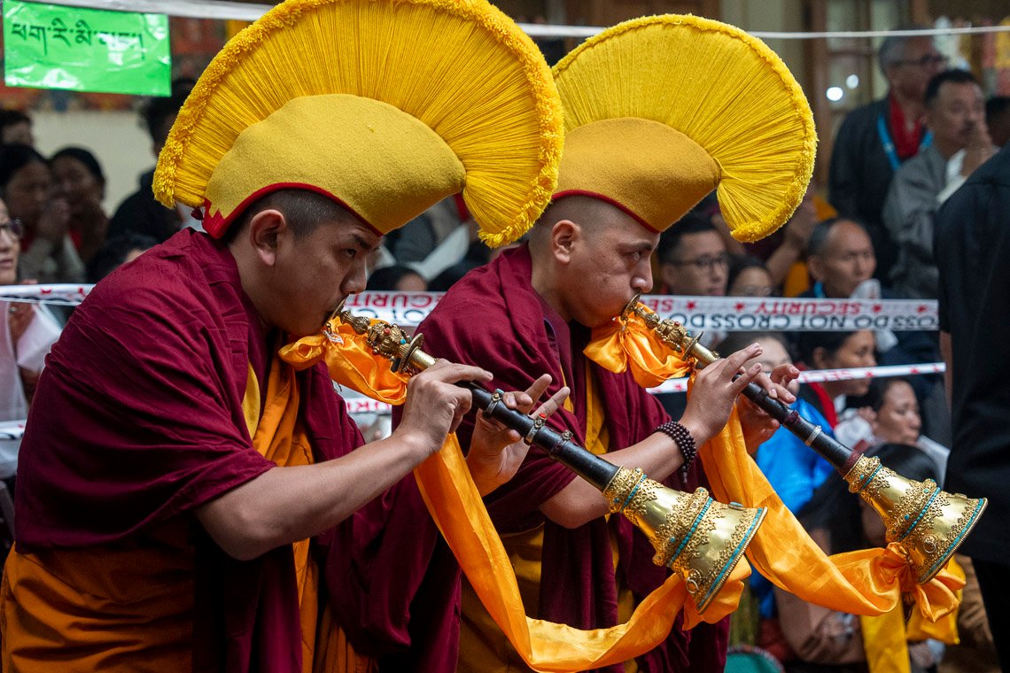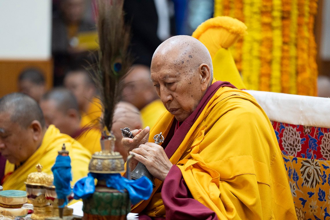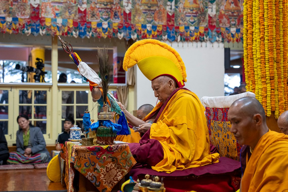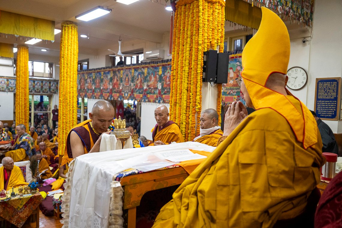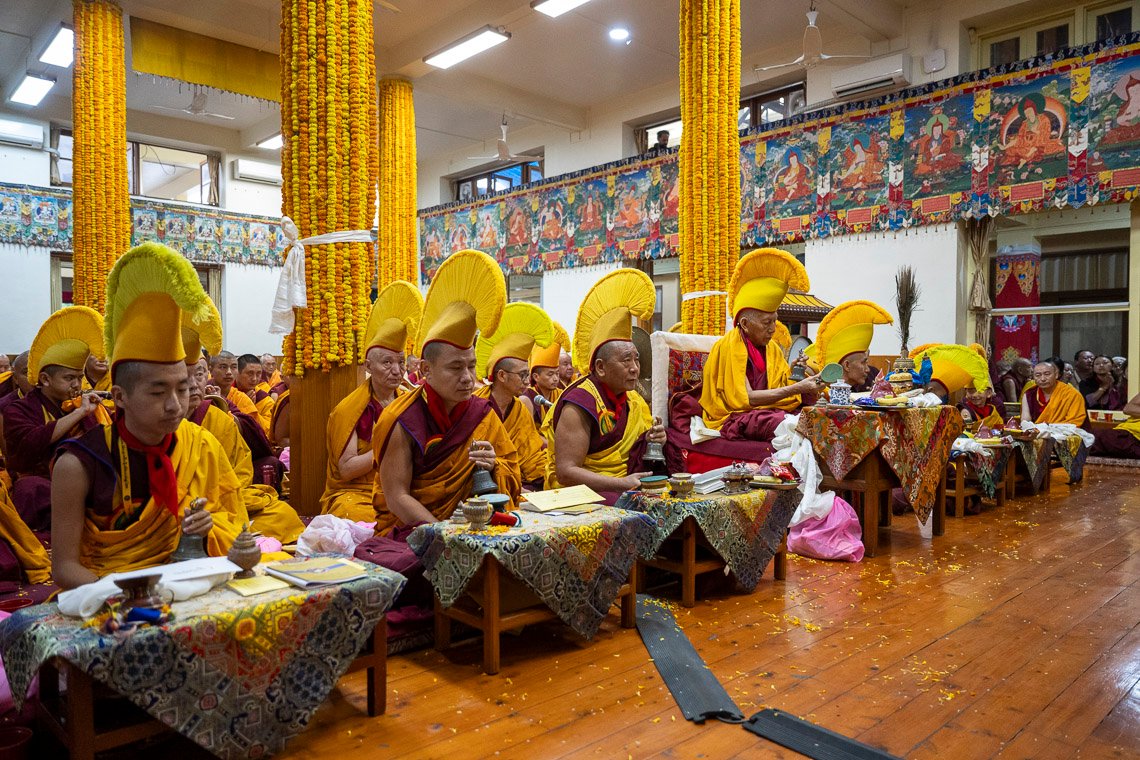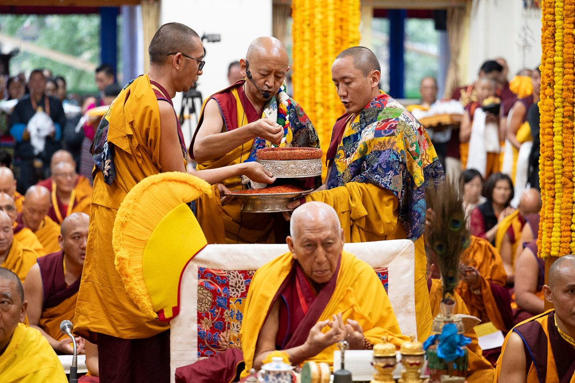 Как только Его Святейшество сел на трон, зазвучали молитвы. Сегодняшняя церемония была основана на ритуале «Дарование сущности бессмертия чистого видения Амитаюса», составленном Великим Пятым Далай-ламой. Молебен возглавлял досточтимый Самдонг Ринпоче. Справа от него сидел настоятель монастыря Гьюдмед, а слева расположились настоятель монастыря Шанг Гаден Чойкхорлинг и молодые воплощения Дромо Геше Ринпоче, Геше Лхундупа Сопы и бывшего настоятеля монастыря Се-Гью.