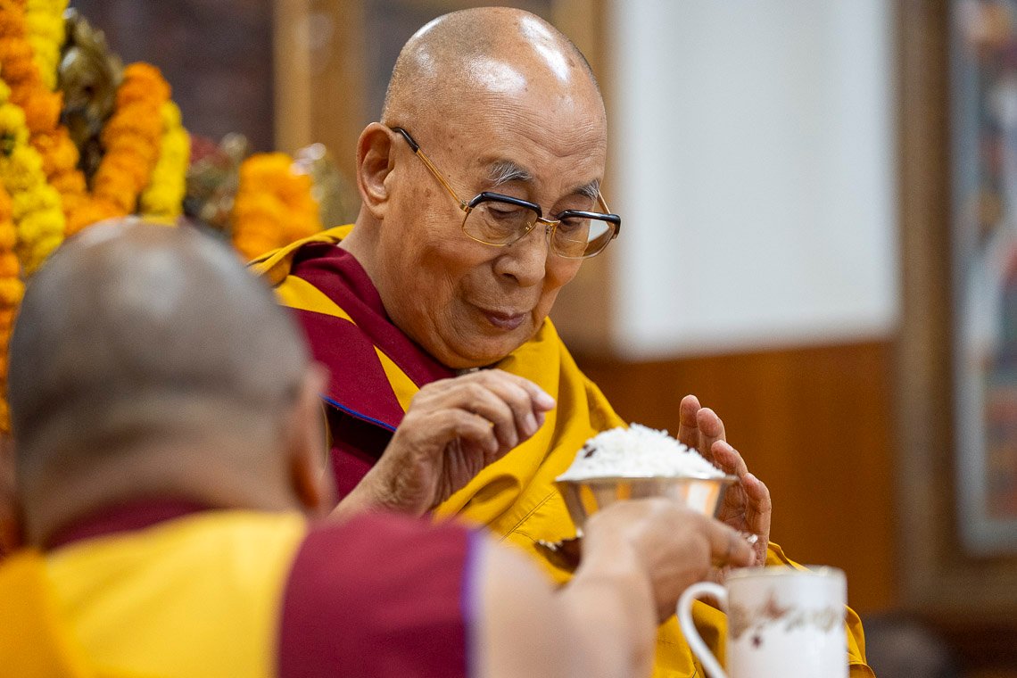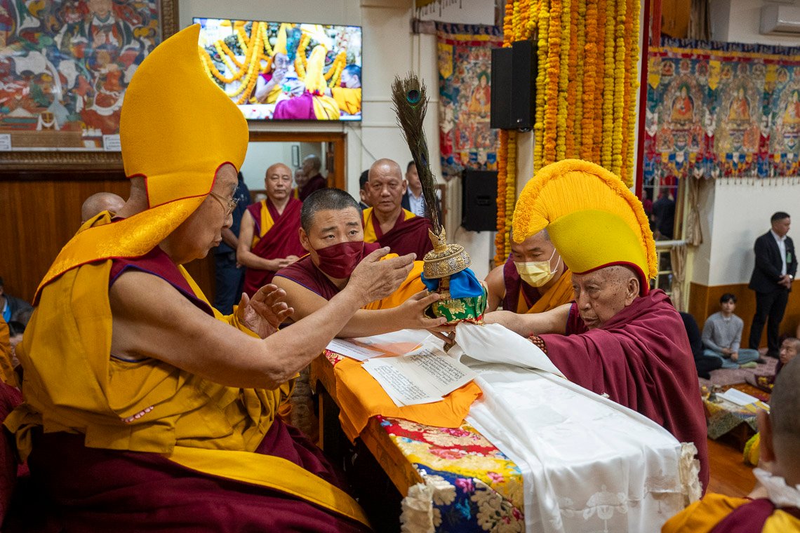 Ритуал Амитаюса включал в себя рефрен: «Время пришло, молю, даруй духовное достижение бессмертия». Взмахнув жезлом долгой жизни с ярким шелковым знаменем, Самдонг Ринпоче преподнес его Далай-ламе. Пока читали молитву о долголетии Его Святейшества, составленную им по просьбе Дилго Кьенце Ринпоче, поднесли большое ритуальное угощение (торма).