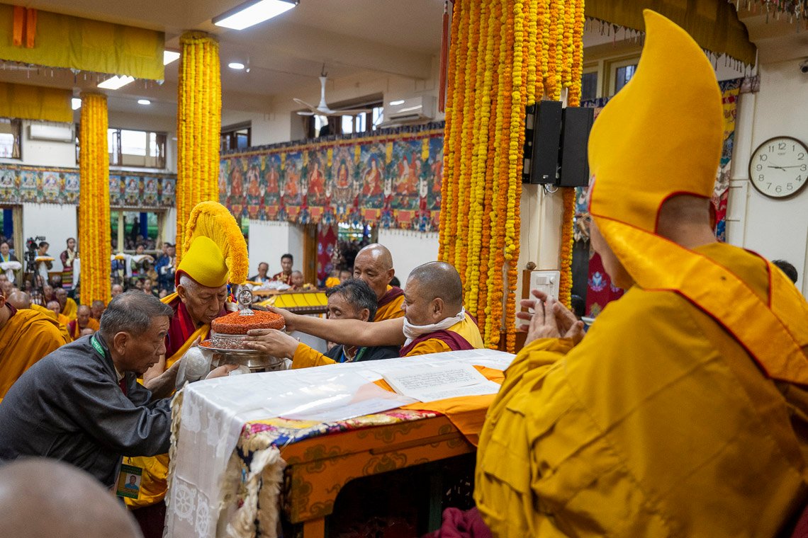 Члены организационного комитета молебна о долголетии Его Святейшества Далай-ламы готовятся совершить подношения духовному лидеру. Дхарамсала, штат Химачал-Прадеш, Индия. 7 мая 2025 г. Фото: дост. Замлинг Норбу (Офис ЕСДЛ)