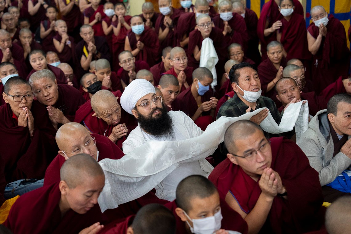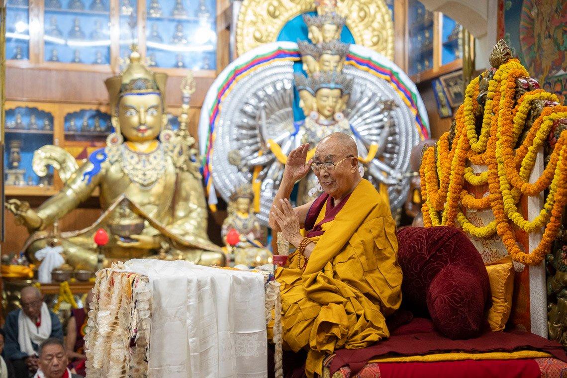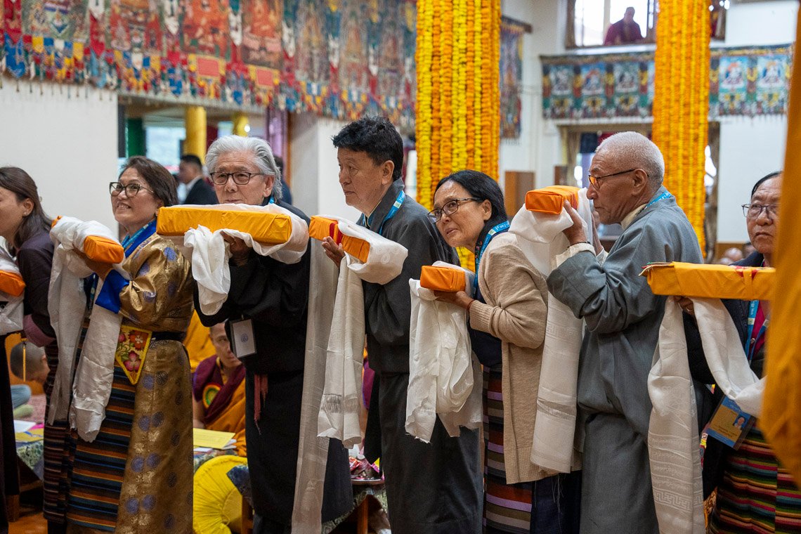 Затем Его Святейшество обратился к собравшимся: «Итак, сегодня здесь члены общины монастыря Шанг Гаден Чойкхорлинг, а также представители сообществ Чатринг и Пхари вознесли молитвы о моем долголетии. Ваши преданность и искренность не вызывают сомнений – спасибо вам».