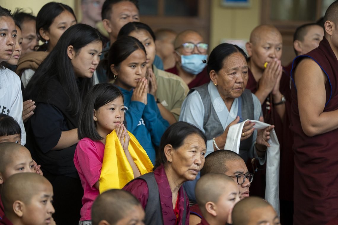 Его Святейшество Далай-лама начитывает мантру ОМ МАНИ ПАДМЕ ХУМ во время молитвенного собрания «Мани дхундуб». Главный тибетский храм Цуглаканг, Дхарамсала, Индия. 1 июня 2025 г. Фото: Тензин Чойджор