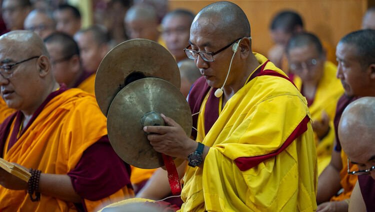 Мастер пения монастыря Сера Ме ведет молебен Будде Медицины с участием Его Святейшества Далай-ламы в главном тибетском храме. Дхарамсала, штат Химачал-Прадеш, Индия. 15 июня 2025 г. Фото: Тензин Чойджор
