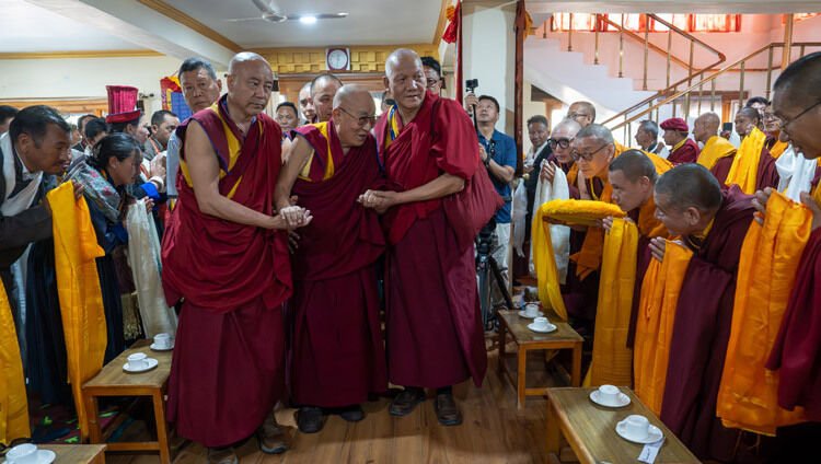 Его Святейшество приветствовали монахи и монахини, нараспев читающие молитвы и играющие на рожках, барабанах и тарелках. У входа в резиденцию несколько групп ладакских барабанщиков встречали Его Святейшество ритмичной игрой на барабанах.