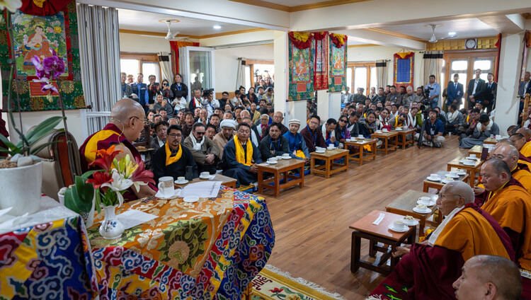 Его Святейшество Далай-лама обращается к собравшимся во время приветственной церемонии в своей резиденции в Шивацель. Лех, Ладак, Индия. 12 июля 2025 года. Фото: Тензин Чойджор