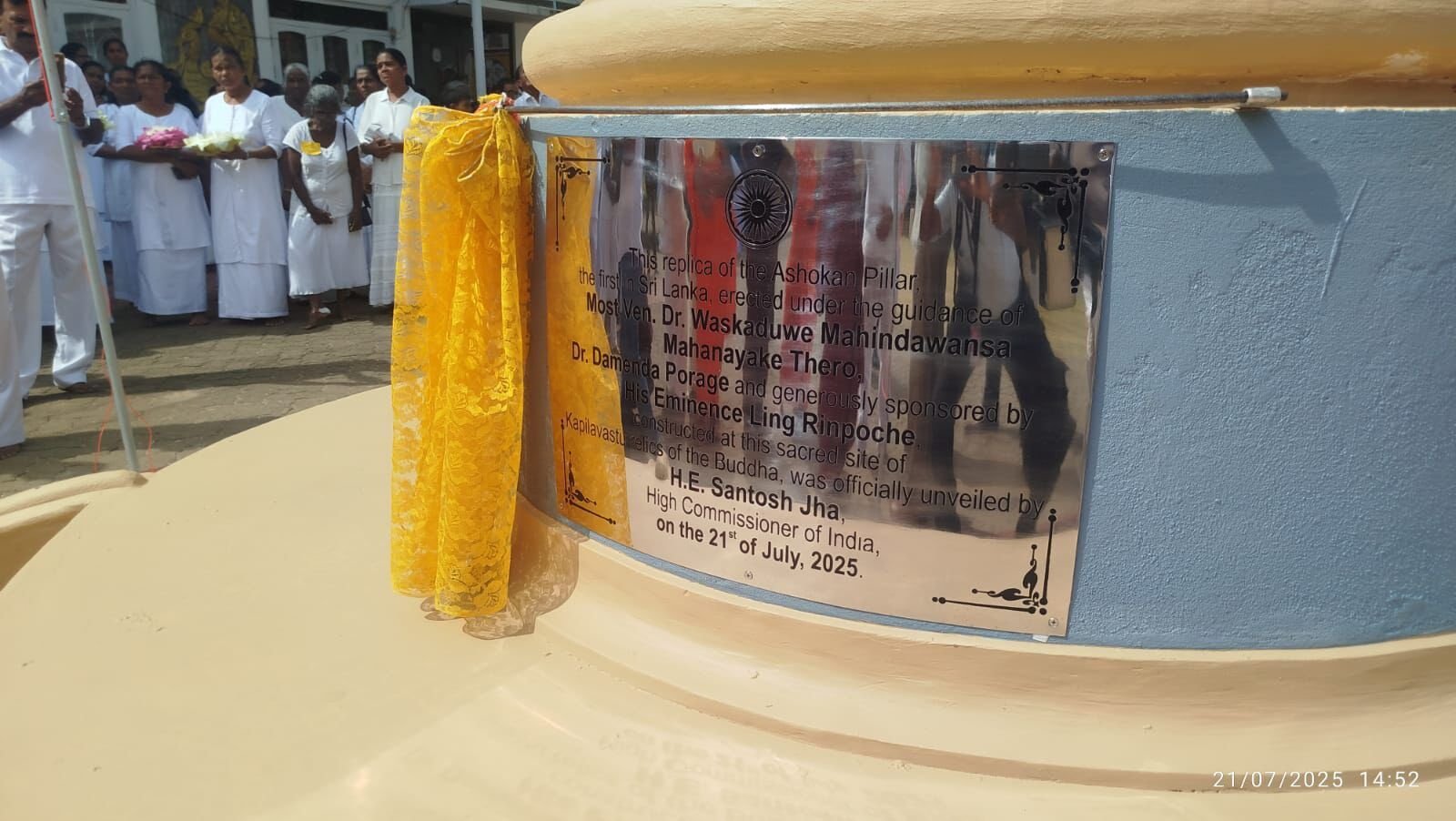 21 июля на территории храма Васкадува Шри Субхути, одного из священных мест Шри-Ланки, хранящего реликвии Будды Шакьямуни, состоялось торжественное открытие первой на острове копии исторической колонны Ашоки. В церемонии открытия приняли участие настоятель храма досточтимый Васкадуве Махиндаванса Маханаяка Тхеро, верховный комиссар Индии в Шри-Ланке Сантош Джха в качестве почетного гостя и другие высокопоставленные лица.