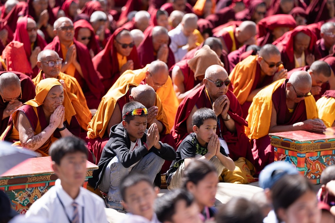 Слушатели повторяют строки зарождения бодхичитты за Его Святейшеством Далай-ламой во время учения на площадке Калачакры. Лех, Ладак, Индия. 16 августа 2025 г. Фото: Тензин Чойджор (Офис ЕСДЛ)