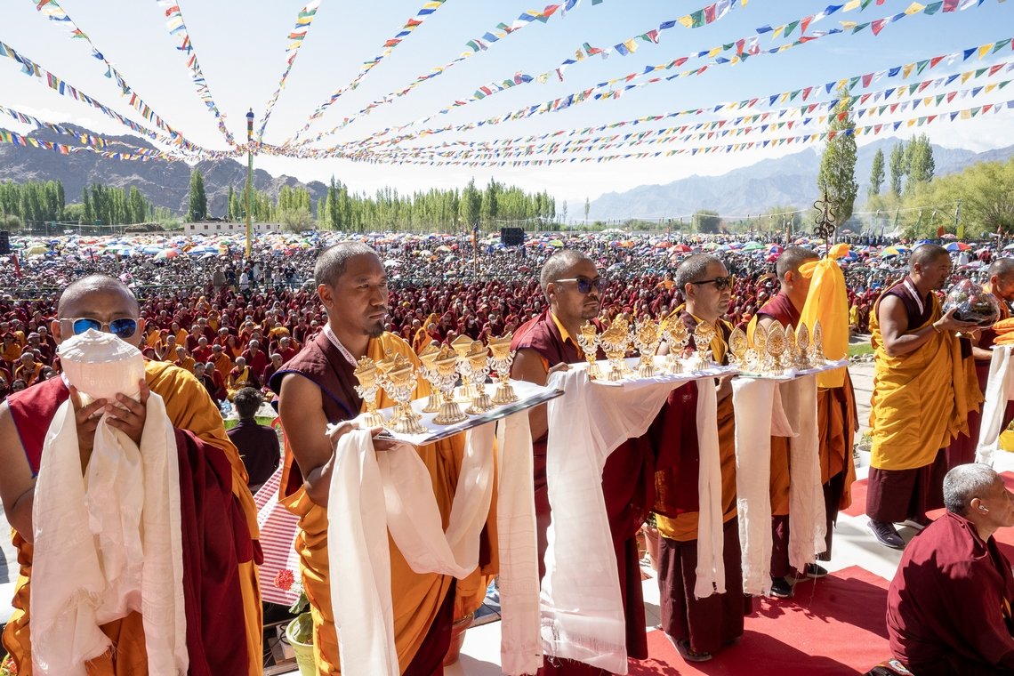 Представители Буддийской ассоциации Ладака и Ассоциации монастырей Ладака выразили почтение Его Святейшеству. Тиксе Ринпоче преподнес духовному лидеру мандалу, а также символы тела, речи и ума Будды; монашеские одеяния; чашу для подаяний, наполненную фруктами, и монашеский жезл. Каждый из даров Его Святейшество подносил ко лбу в знак уважения. Затем духовному лидеру преподнесли восемь благоприятных символов, семь символов царской власти и восемь благоприятных субстанций с пожеланием как можно дольше оставаться в этом мире.