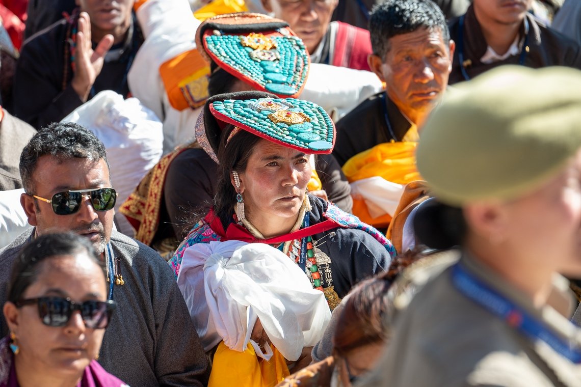 Шевацель, Лех, Ладак, Индия, 17 августа 2025 г. – Сегодня, уже второй день подряд, на площадке Калачакры, прилегающей к храму Шевацель Пходранг, под палящим солнцем собралось около 50 000 человек. Их всех привело сюда стремление вознести молитвы о долголетии Его Святейшества Далай-ламы. Группа ладакских музыкантов в знак приветствия духовному лидеру энергично играла на барабанах и трубах, в то время как Его Святейшество выехал из своей резиденции и отправился на дальний конец площадки, в павильон для проведения учений. Устроителями и непосредственными участниками сегодняшней церемонии выступили Буддийская ассоциация Ладака и Ассоциация монастырей Ладака.