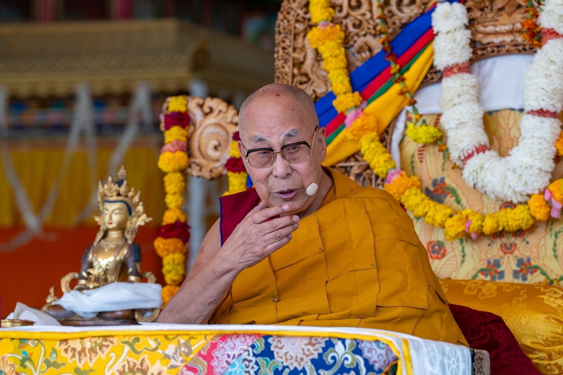 Его Святейшество Далай-лама обращается к собравшимся во время церемонии подношения молебна о долголетии. Лех, Ладак, Индия. 17 августа 2025 г. Фото: Тензин Чойджор (Офис ЕСДЛ)