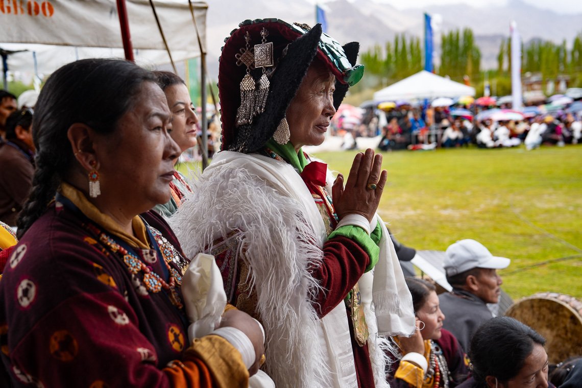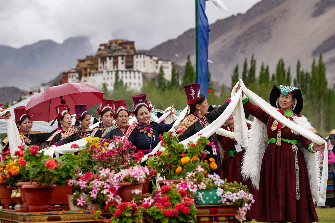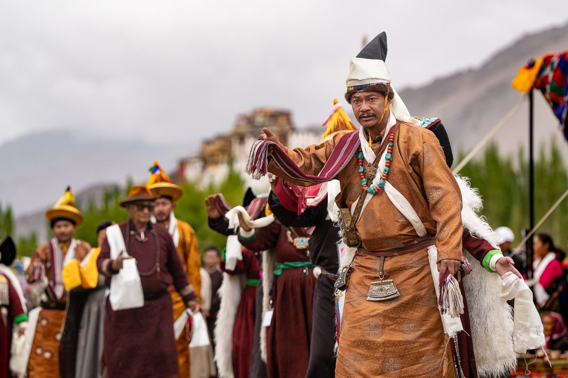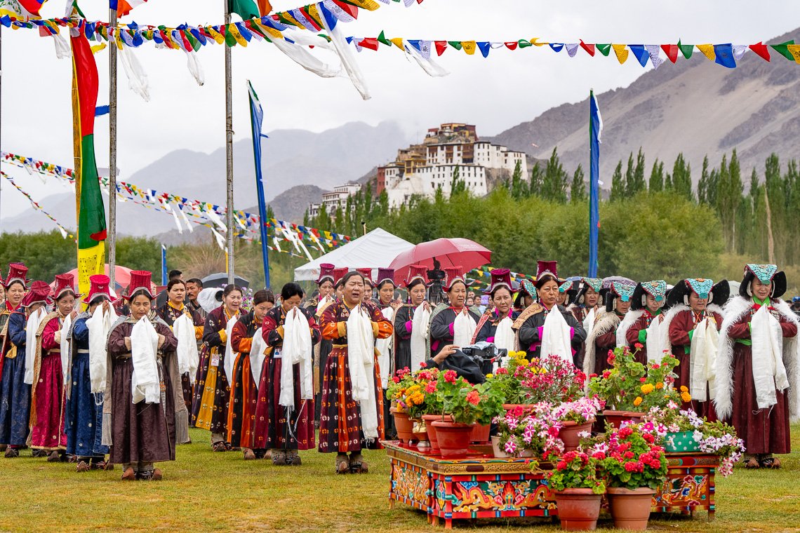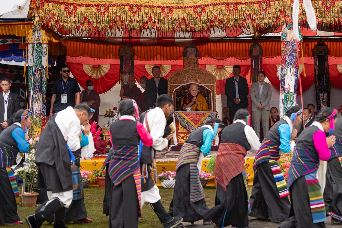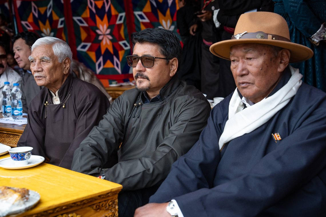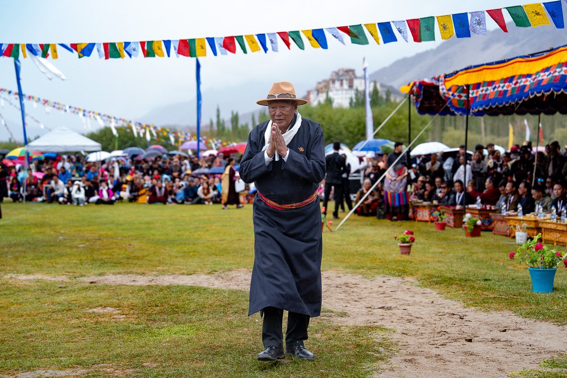 Его Святейшество Далай-лама наблюдает за выступлениями артистов во время обеда в парке Аби-Спанг в Спитуке. Лех, Ладак, Индия. 24 августа 2025 г. Фото: Тензин Чойджор