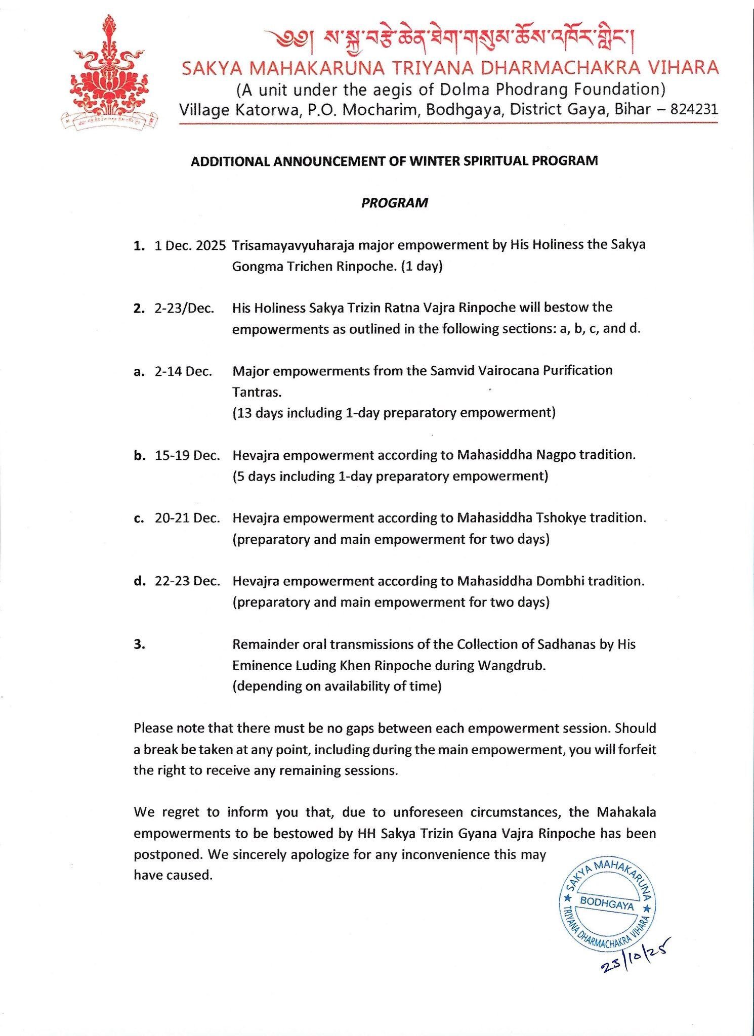 О дополнительной программе, которая начнется с 1 декабря сообщает страница индийского Сакья-центра в соцсетях. Его Святейшество Сакья Гонгма Тричен Ринпоче и 42-й Сакья Тризин Ратна Ваджра Ринпоче даруют ряд посвящений.