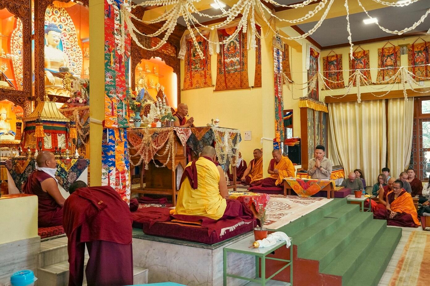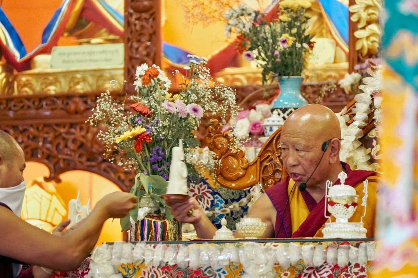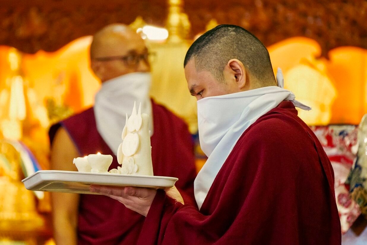 В первый день прошли предварительные церемонии к посвящению Гухьясамаджи — одной из важнейших тантр традиции гелуг. В течение пяти дней Ринпоче даст три главных посвящения: Гухьясамаджи, Чакрасамвары в традиции Луипы и Тринадцати божеств Ваджрабхайравы.