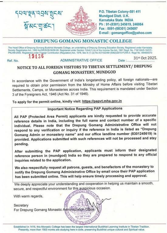 Особое внимание необходимо уделить правильности заполнения заявок на PAP. Заявителей настоятельно просят указывать точные контактные данные поручителя в Индии (reference in India), включая полное имя и номер телефона конкретного человека. Администрация монастыря Дрепунг Гоманг подчеркивает, что заявки, где в качестве поручителя указано «Администрация Дрепунг Гоманга» или «Монастырь Дрепунг Гоманг», а также дан стационарный номер телефона монастыря (8301245619), не будут рассматриваться, останутся в статусе ожидания или будут отклонены.