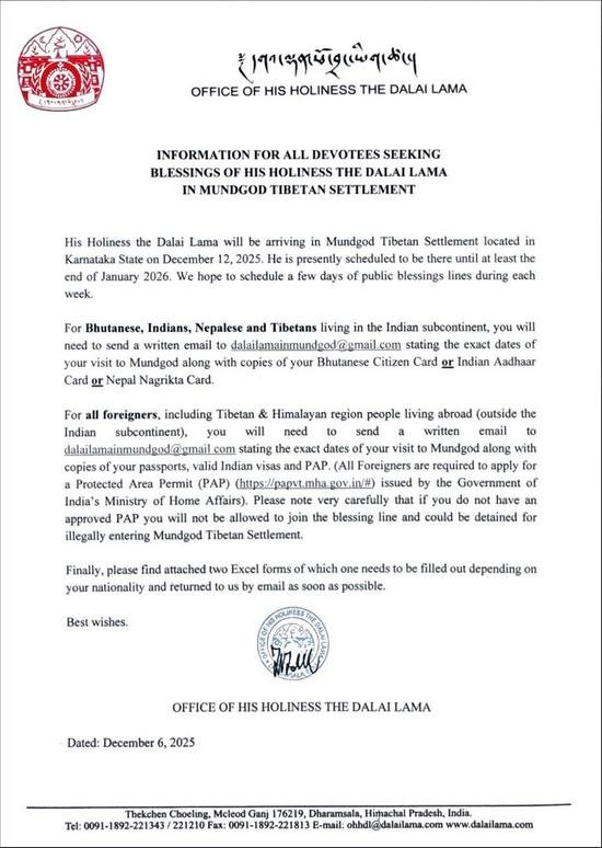 Его Святейшество Далай-лама прибудет в Мундгод 12 декабря 2025 года и пробудет там, по меньшей мере, до конца января 2026 года. Планируется, что в течение этого периода духовный лидер будет еженедельно проводить публичные аудиенции и даровать благословение.