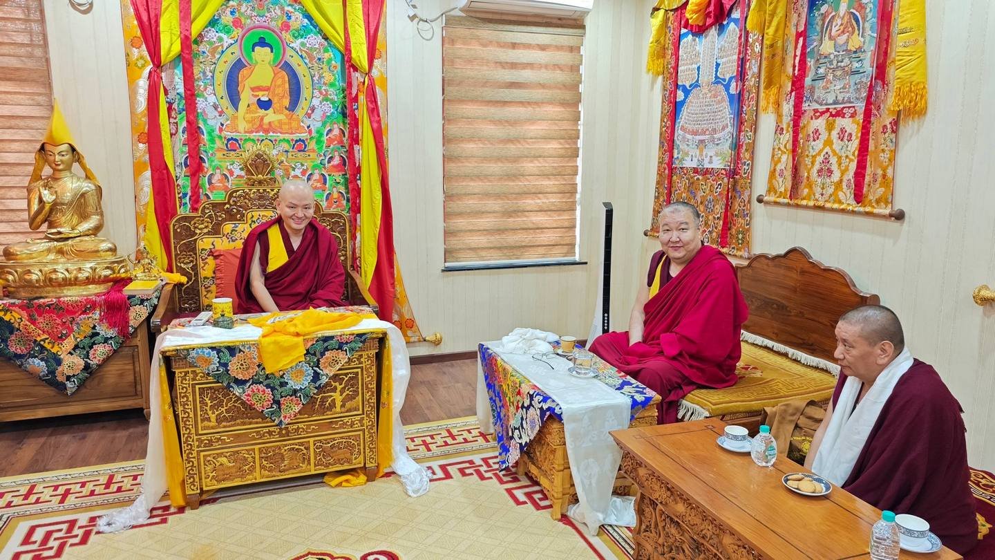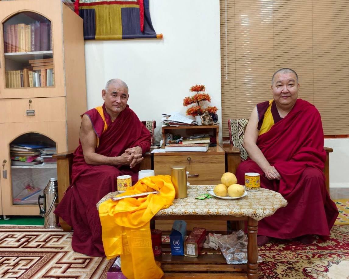 Во время встречи Верховного ламы Калмыкии, настоятеля Центрального хурула Калмыкии геше Тензина Чойдака с Кунделингом Тацаком Ринпоче XIII. Фото: Центральный хурул Калмыкии