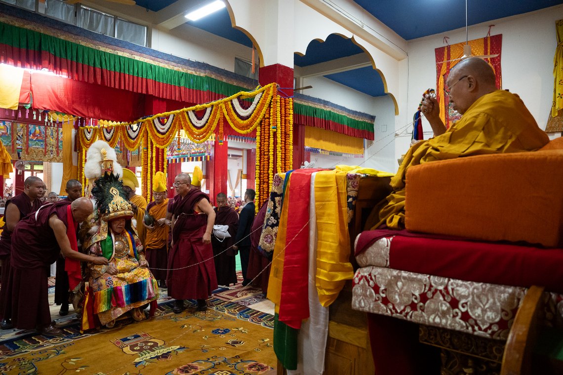 Во время молебна о долголетии Его Святейшества Далай-ламы оракул Нечунг занимает место напротив духовного лидера. Мундгод, штат Карнатака, Индия. 24 декабря 2025 г. Фото: Тензин Чойджор (Офис ЕСДЛ)