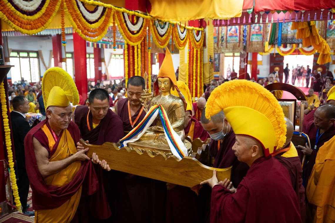Его Святейшеству Далай-ламе преподносят статую Джамьянга Чодже в знак благодарности от монашеской общины Дрепунга. Мундгод, штат Карнатака, Индия. 24 декабря 2025 г. Фото: Тензин Чойджор (Офис ЕСДЛ)