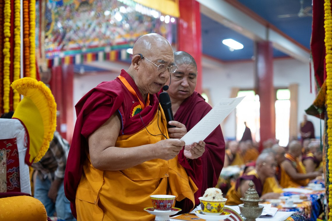 Молебен о долголетии Его Святейшества начался с «Обращения к шестнадцати архатам», или старейшинам, которым Будда поручил защищать его Учение. Дрепунг Трипа совершил предварительное подношение мандалы, после чего Ганден Трипа, Шарпа Чодже, Бонпо Менри Тризин, настоятели монастырей Гоманг и Лоселинг, бывшие Дрепунг Трипы, бывшие настоятели Лоселинга и Гоманга, а также некоторые меценаты обратились к Его Святейшеству за благословением.