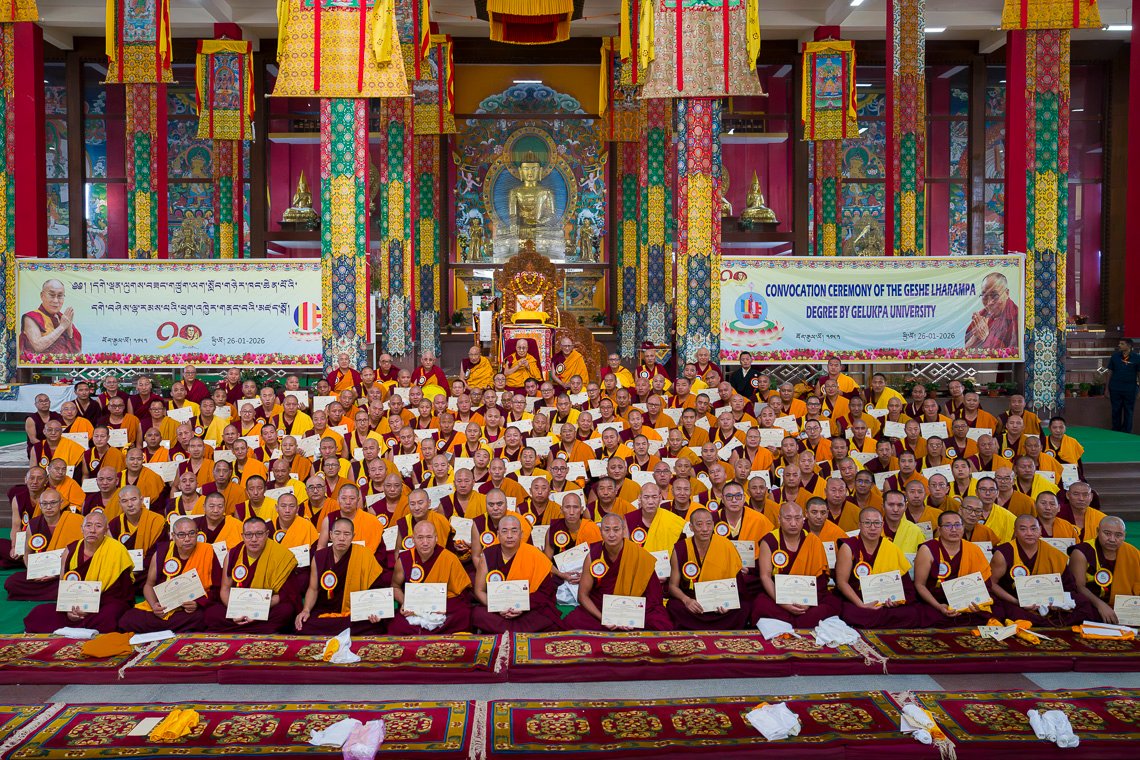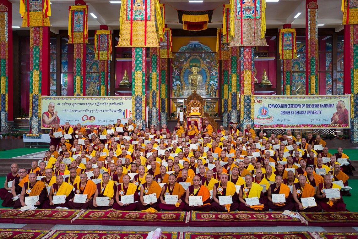 26 января 2026 года Его Святейшество Далай-лама принял участие в торжественной церемонии вручения дипломов геше-лхарамбы 354 выпускникам из монастырей Дрепунг, Сера, Ганден, Таши Лхунпо и Рато. В ходе церемонии, организованной университетом Гелугпа, духовный лидер даровал монахам благословение. Встреча состоялась на площадке для философских диспутов монастыря Дрепунг Гоманг в штате Карнатака на юге Индии.