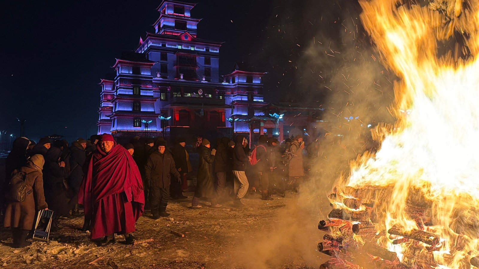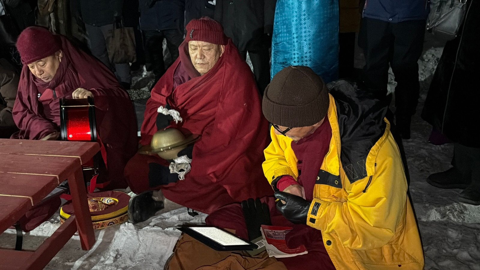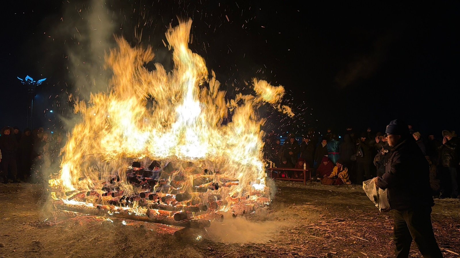 В 6 утра перед монастырем состоялся ритуал Сан-салыр. Верующие встретили первые лучи солнца уже на месте проведения буддийской практики и совершили три круга обхождения вокруг священного костра с молитвой, благодарностью и надеждой на благословенный год.