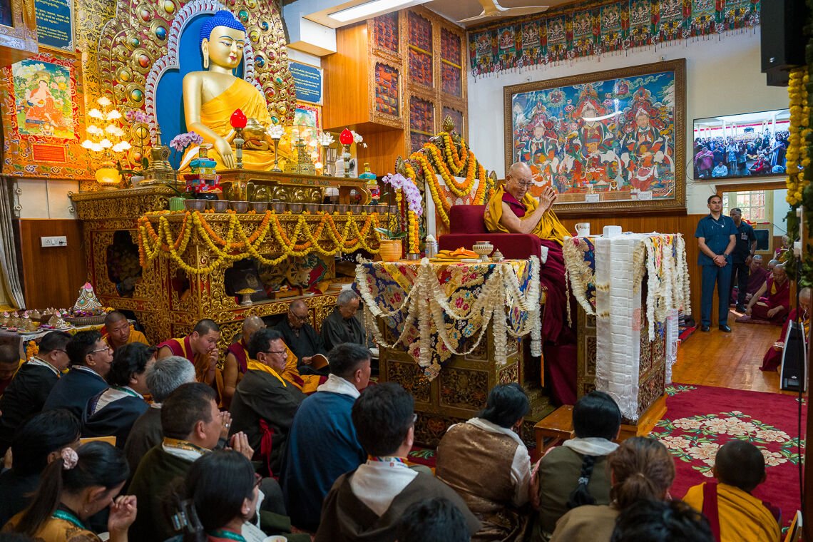 Совершили подношение мандалы с просьбой о том, чтобы Его Святейшество жил долго на благо живых существ и учения Будды. Затем лама, возглавлявший церемонию, преподнес статую Белой Тары, символизирующую просветленное тело, текст, символизирующий просветленную речь, и ступу, символизирующую просветленный ум.